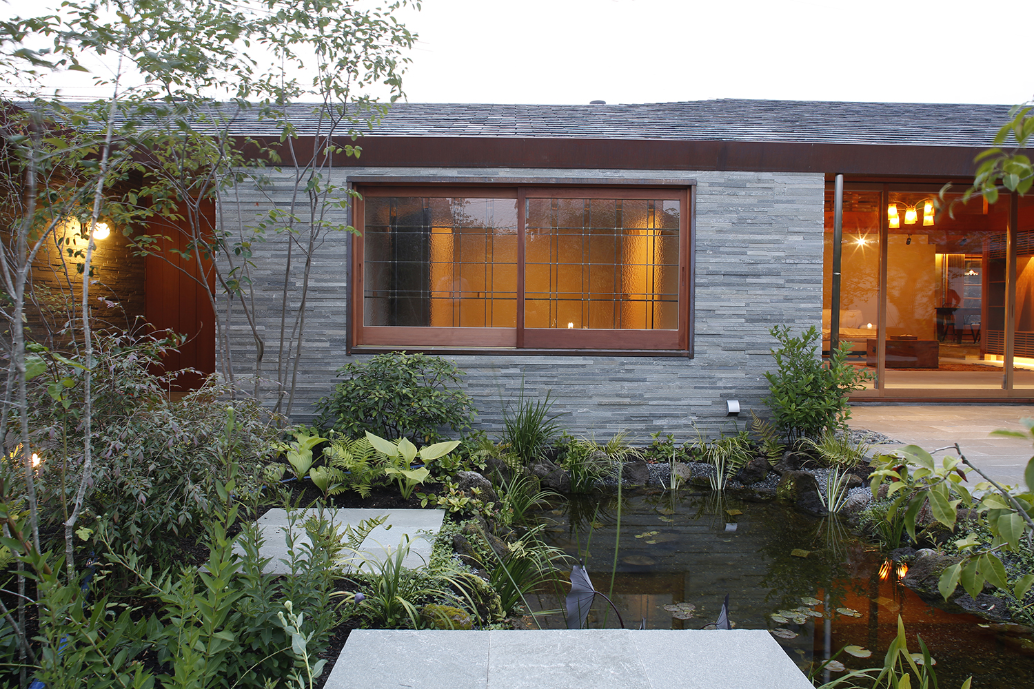天然スレートで葺いた屋根は軒を低く深く保ち、周囲の庭とのスケールと調和しながら軽快でダイナミックなフォルムを形成し、室内への熱負荷低減と柔らかい間接光をもたらします。